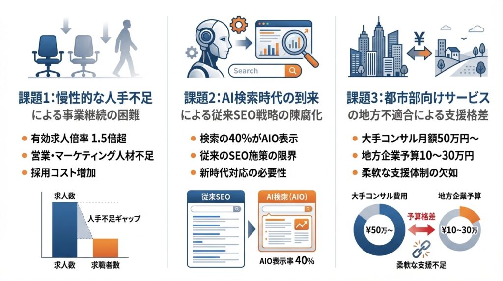 2026年現在、日本の地方企業の78%が経営上の深刻な課題に直面しています(中小企業庁調査より)。特に以下の3つが経営を圧迫しています